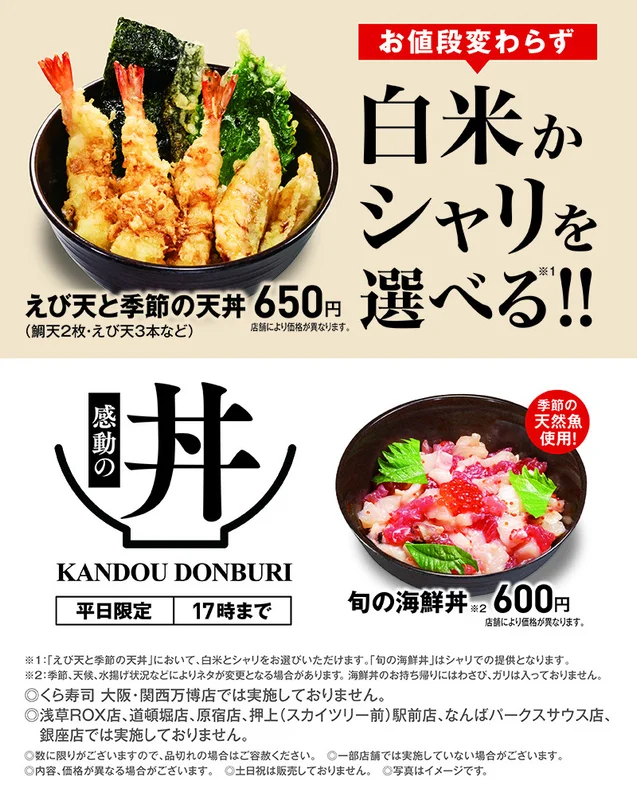 【値上げ】くら寿司の「えび天と季節の天丼」が600円から650円へ値上げ!公開日: 2025年04月18日平日限定で「くら寿司」で提供されいてる「えび天と季節の天丼」の価格が値上げされていました!当サイト sushipo!の集計によると、2025年4月19日より最安値の店舗で600円から650円へ値上げされていました。約8%の値上げとなります。なお、他の丼物である「旬の海鮮丼」、「うにいくらミニ丼」の価格に変更はありませんでした。