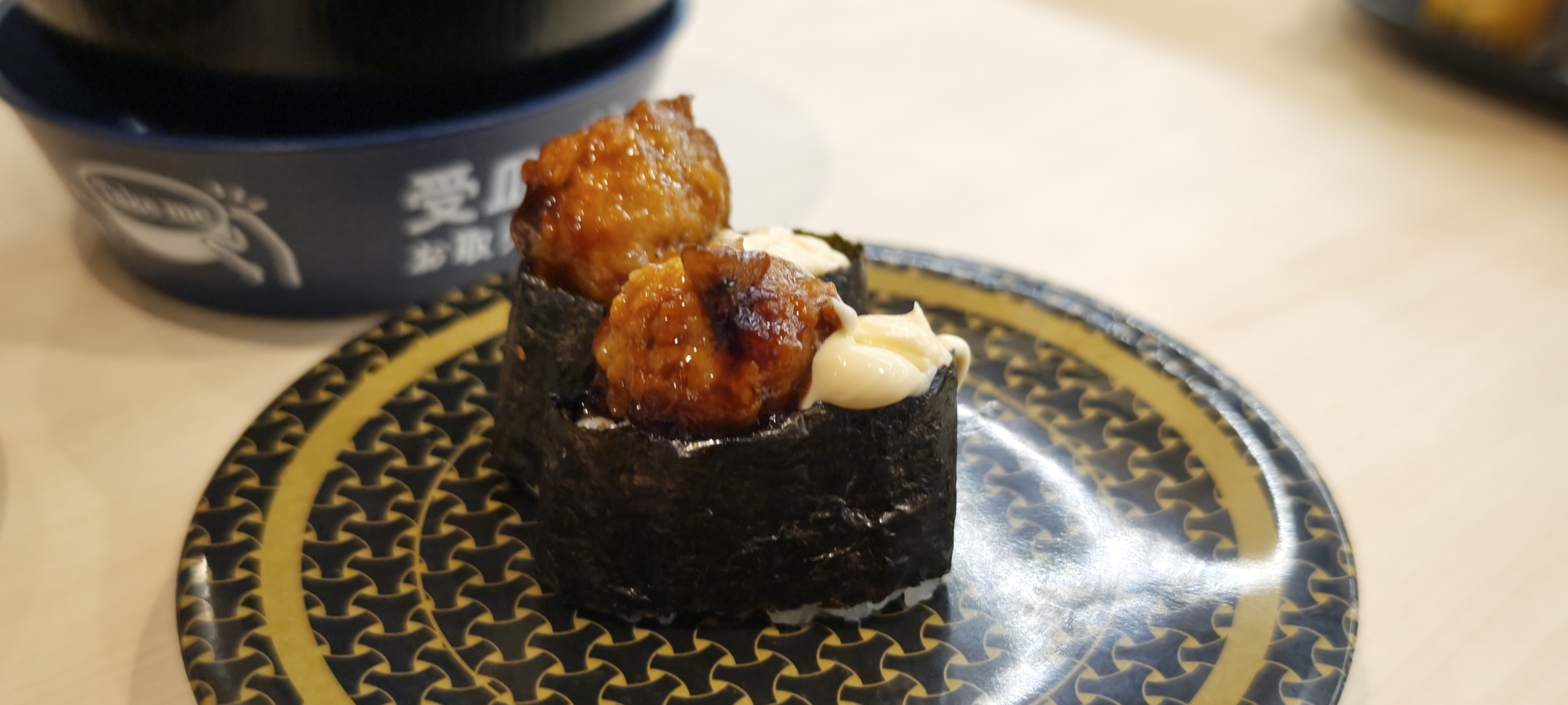 珍しいネタのひとつ。つくねはやわらかくてジューシーで、ほんのり甘めの味付け。寿司というよりおかずのような感覚ですが、軍艦のごはんと意外にマッチしていておいしかったです。