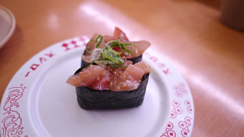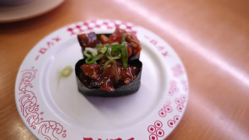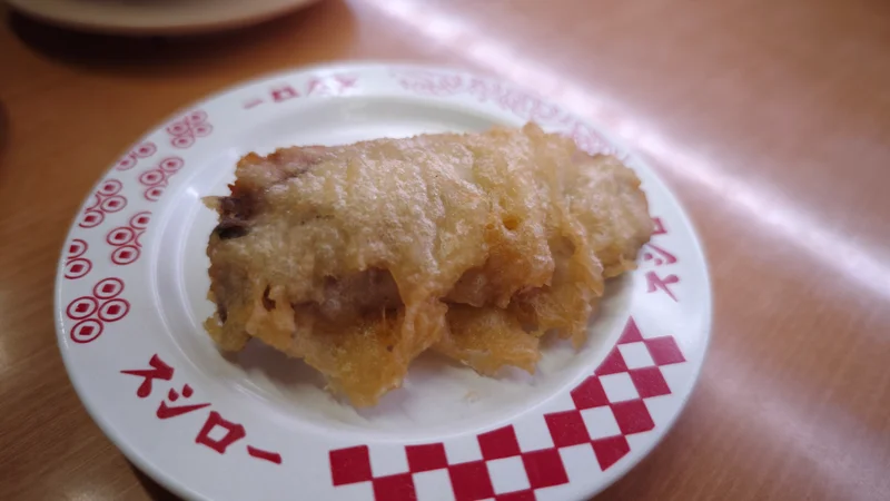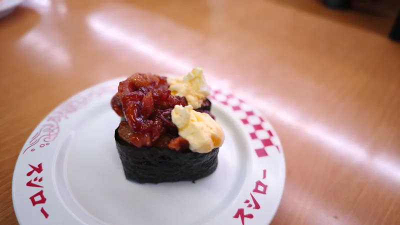 甘辛の照り焼きチキン+たまごサラダという、鉄板コンビが軍艦になった豪華版。 甘みが先にきて、たまごのふんわりしたコクが後から追ってくるので、寿司らしさ+満足感が両立されています。家族連れにもおすすめの一皿です。