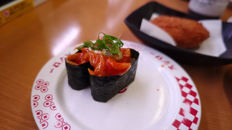 歯ごたえ抜群の白ばい貝ひもに、ピリ辛チャンジャを合わせた軍艦。コリコリ+辛み+ごま油系の風味がワクワクさせる味わいで、寿司をつまみながら“酒モード”にも切り替わりたくなる一皿でした。